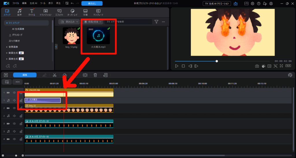 効果音で、「炎の音」「爆発音」 などを追加すれば、よりリアルな仕上がりに!