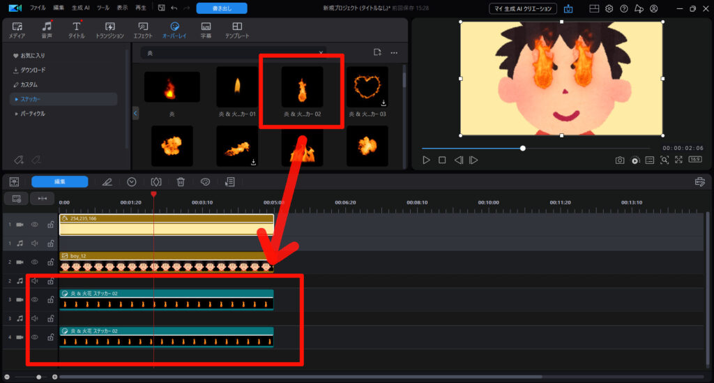 - 使いたいエフェクトを選び、動画に重ねるように配置