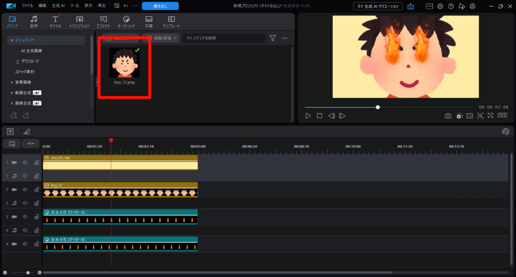 ここからは、実際にPowerDirectorで「炎の動画エフェクト」を入れる手順を解説します。